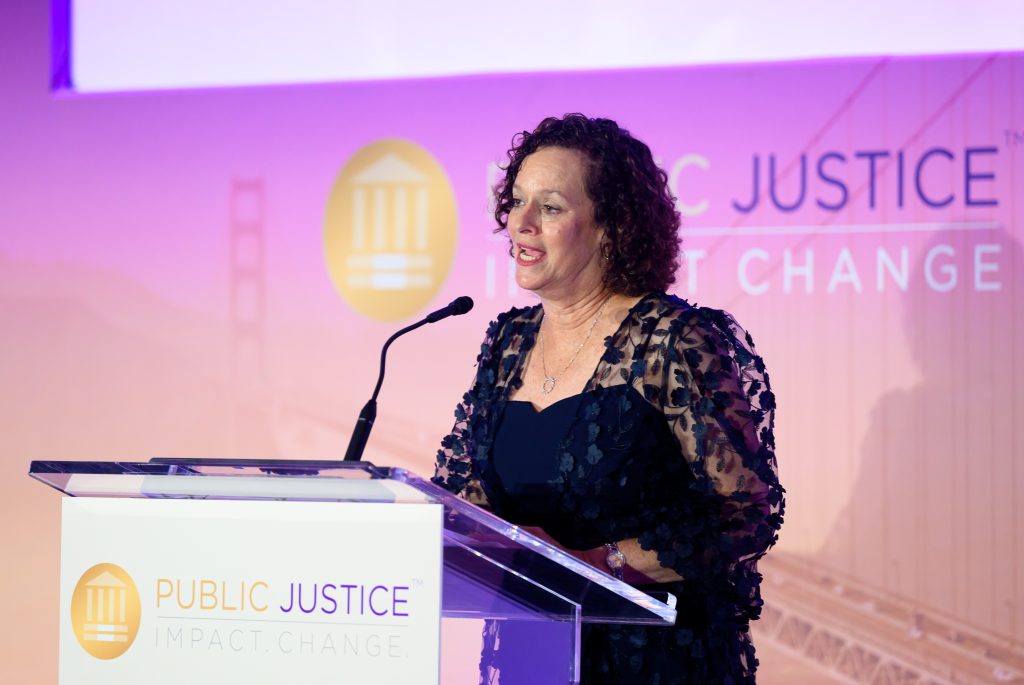 Ellen Presby gives a speech at the 2025 Public Justice Awards Dinner and Gala, held at the Four Seasons in San Francisco on July 21, 2025.